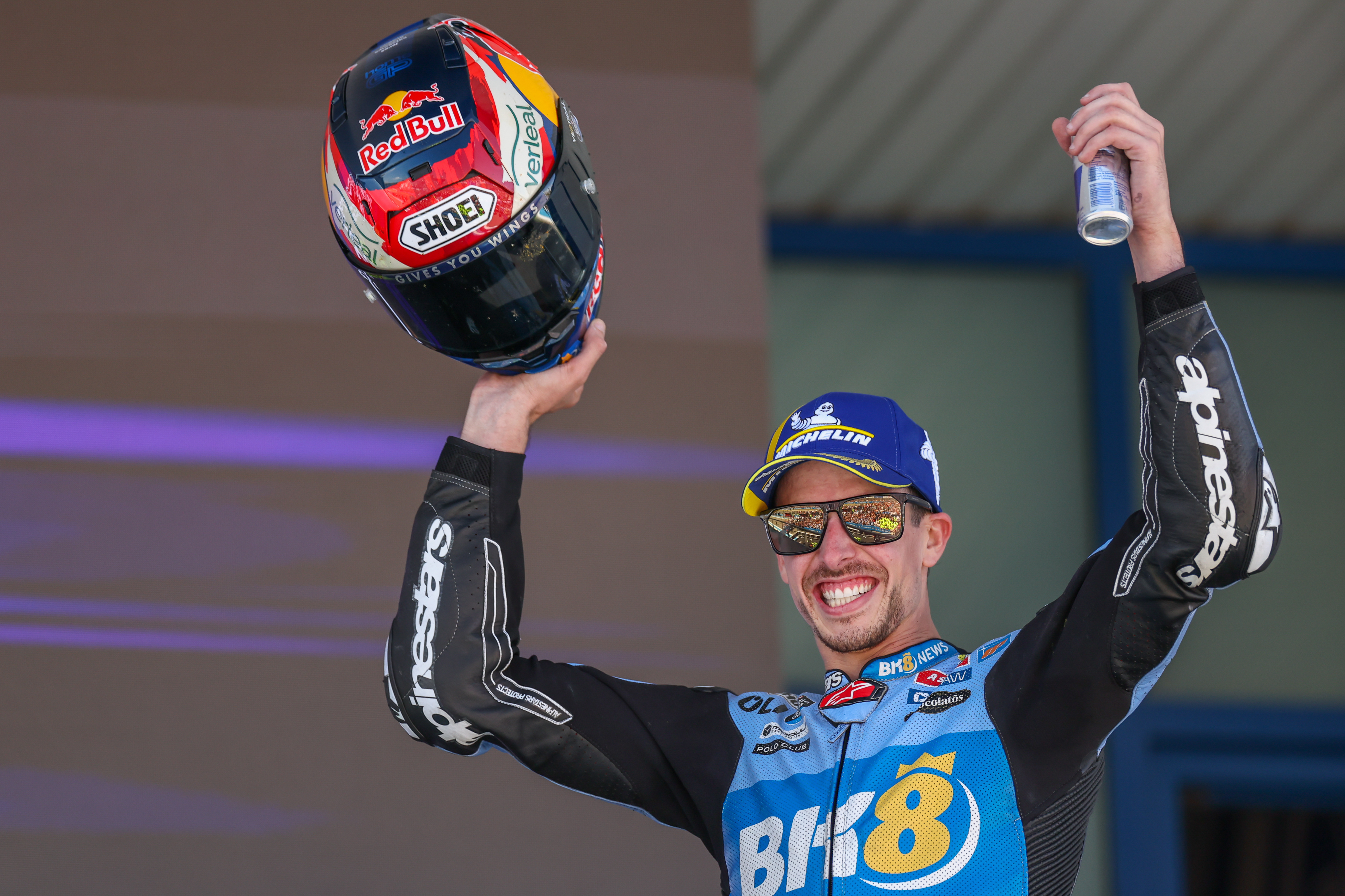 4月26日,冠军Gresini车队西班牙车手阿历克斯·马奎斯在颁奖仪式上庆祝。新华社发(钱俊摄)